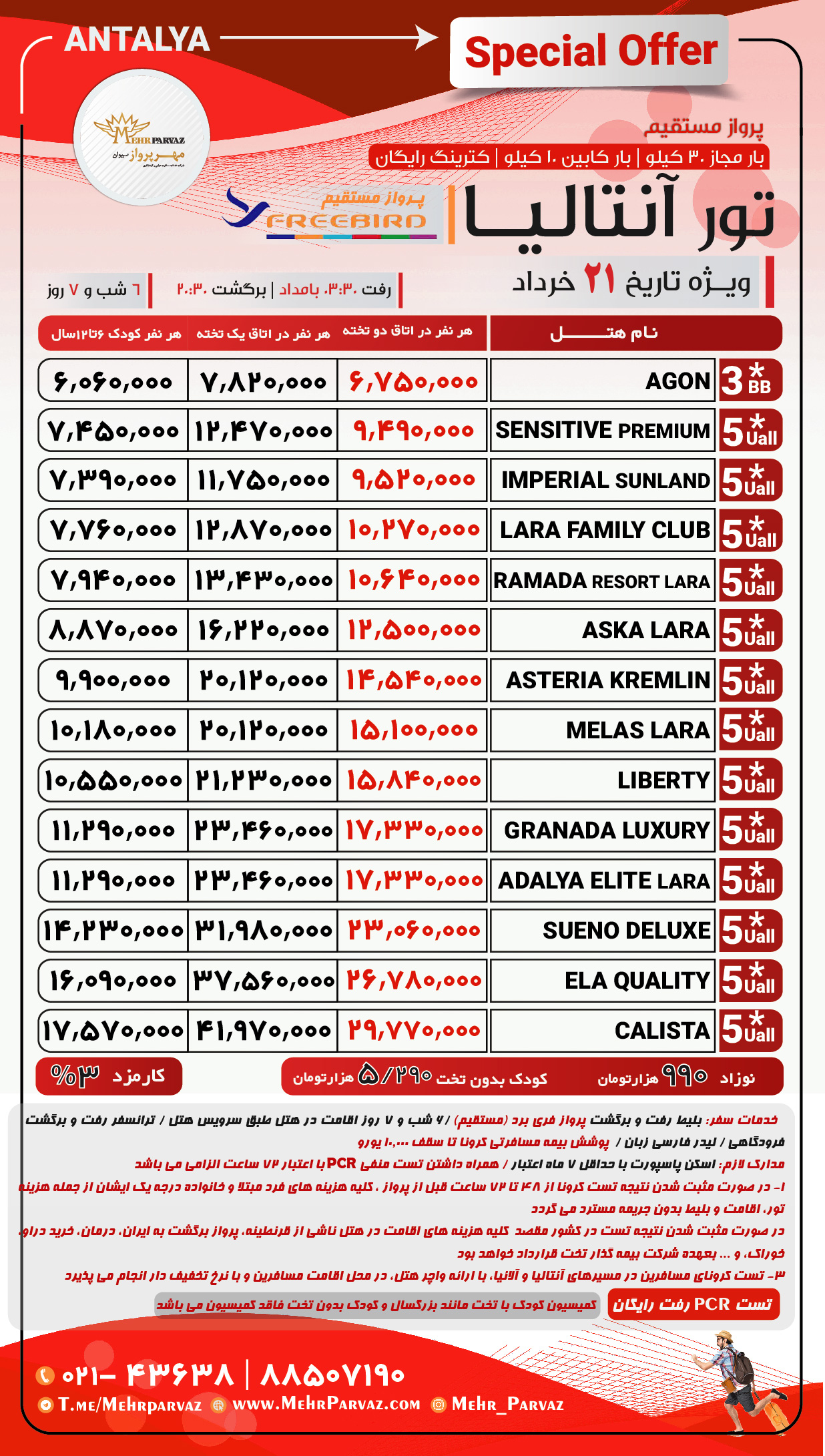 خدمات سفر: بلیط رفت و برگشت پرواز فری برد (مستقیم) ( کترینگ رایگان) /6 شب و 7 روز اقامت در هتل طبق سرویس هتل / ترانسفر رفت و برگشت فرودگاهی / لیدر فارسی زبان / پوشش بیمه مسافرتی کرونا تا سقف 10.000 یورو