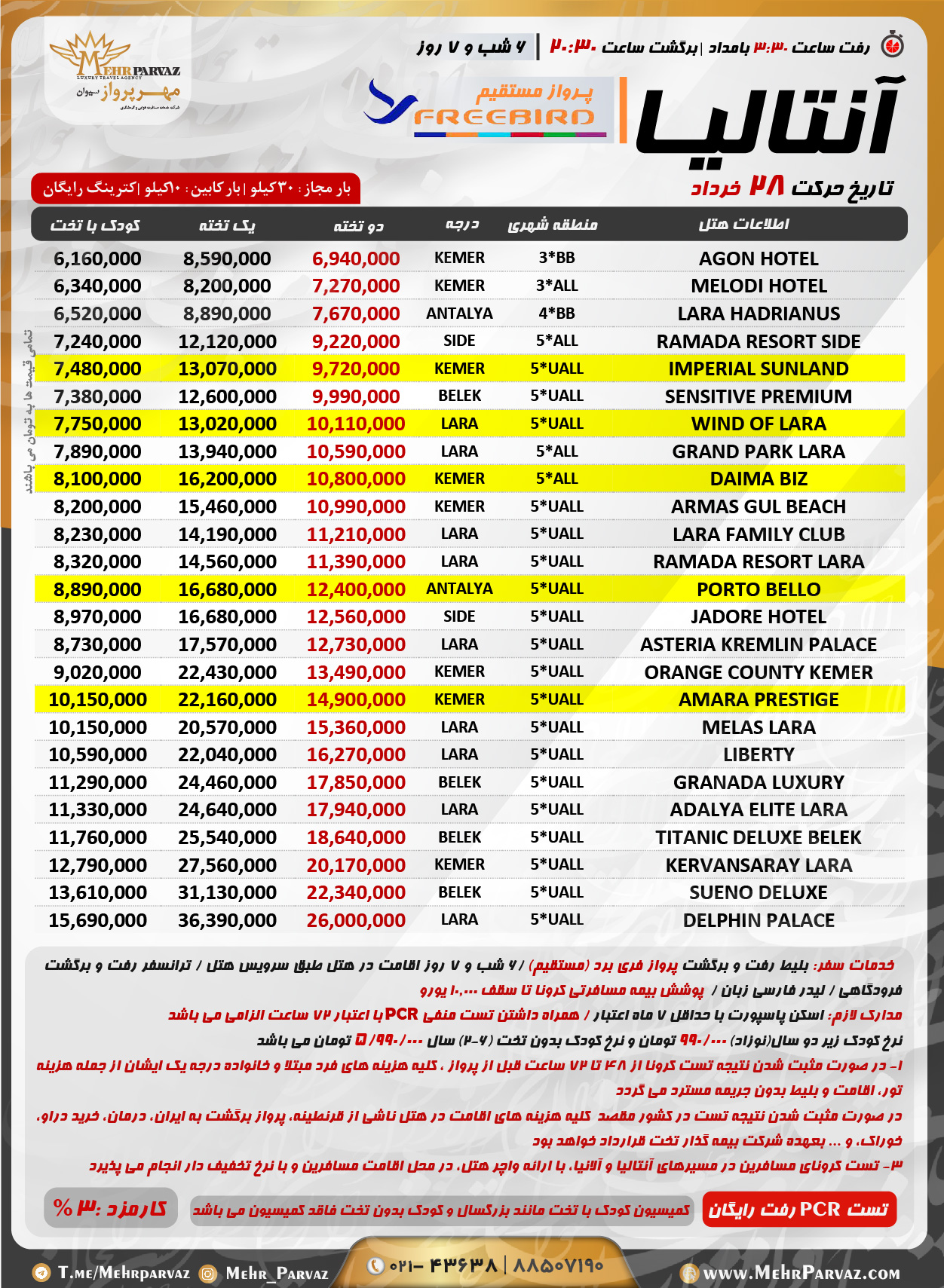 خدمات سفر: بلیط رفت و برگشت پرواز فری برد (مستقیم) ( کترینگ رایگان) /6 شب و 7 روز اقامت در هتل طبق سرویس هتل / ترانسفر رفت و برگشت فرودگاهی / لیدر فارسی زبان / پوشش بیمه مسافرتی کرونا تا سقف 10.000 یورو