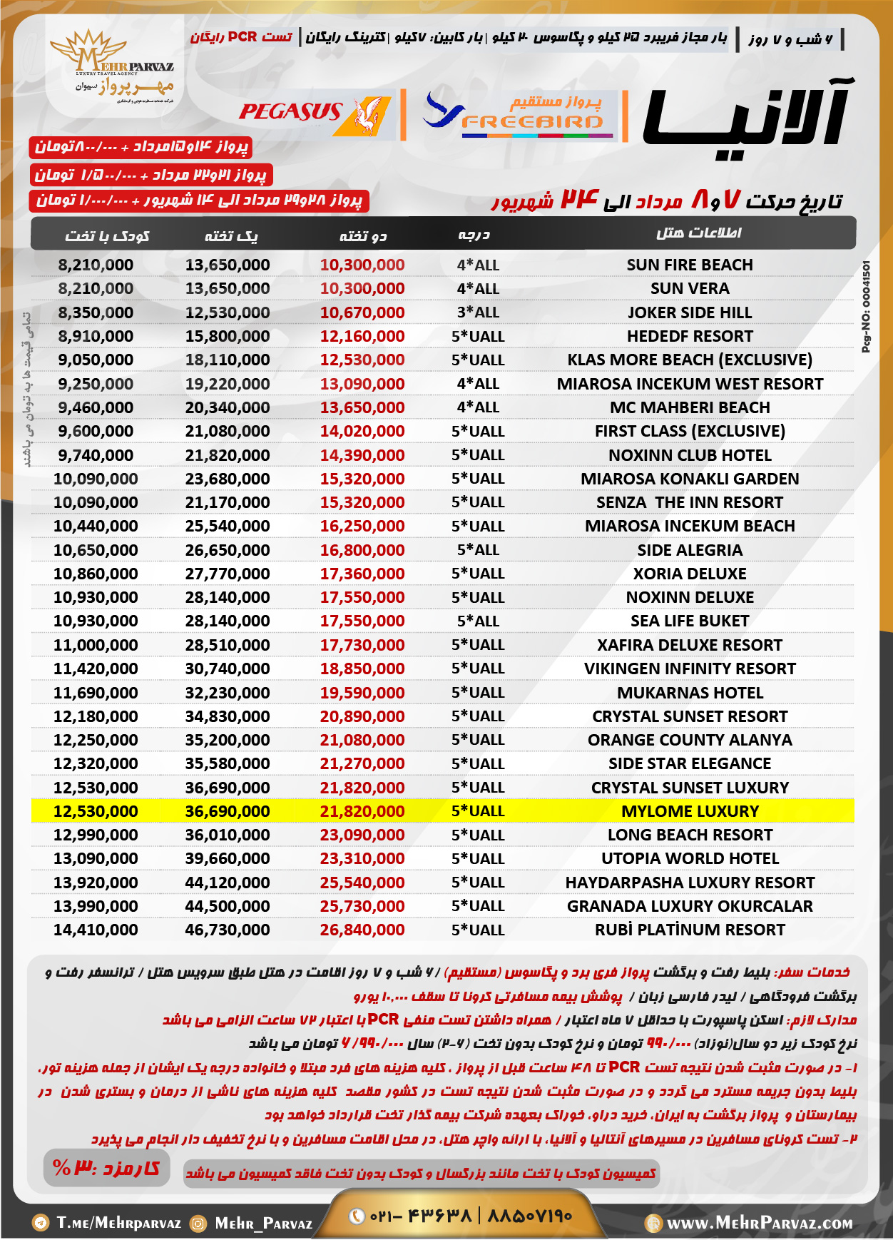 خدمات سفر: بلیط رفت و برگشت پرواز پگاسوس/6 شب و 7 روز اقامت در هتل طبق سرویس هتل / ترانسفر رفت و برگشت فرودگاهی / لیدر فارسی زبان /  پوشش بیمه مسافرتی کرونا تا سقف 10.000 یورو