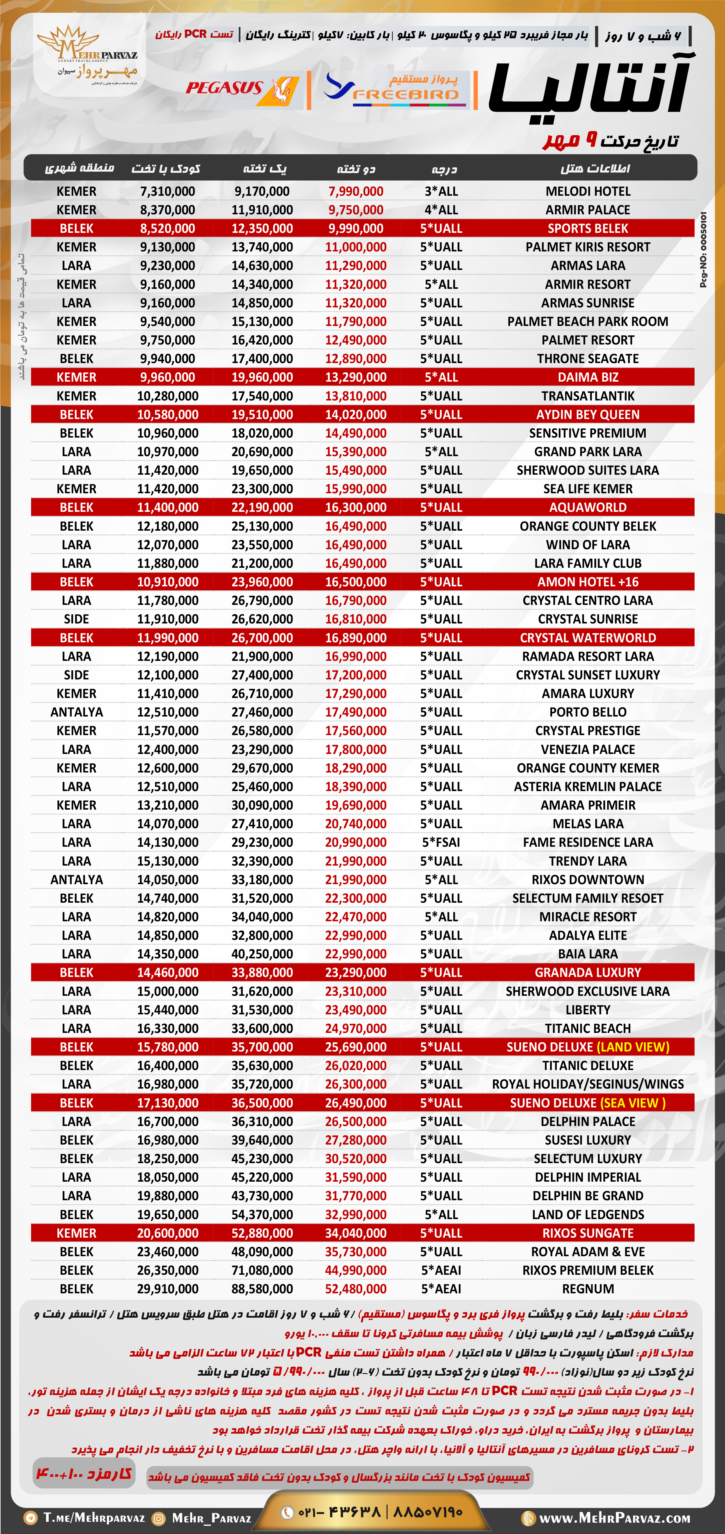 خدمات سفر: بلیط رفت و برگشت پروازمستقیم پگاسوس/6 شب و 7 روز اقامت در هتل طبق سرویس هتل / ترانسفر رفت و برگشت فرودگاهی / لیدر فارسی زبان / پوشش بیمه مسافرتی کرونا تا سقف 10.000 یورو