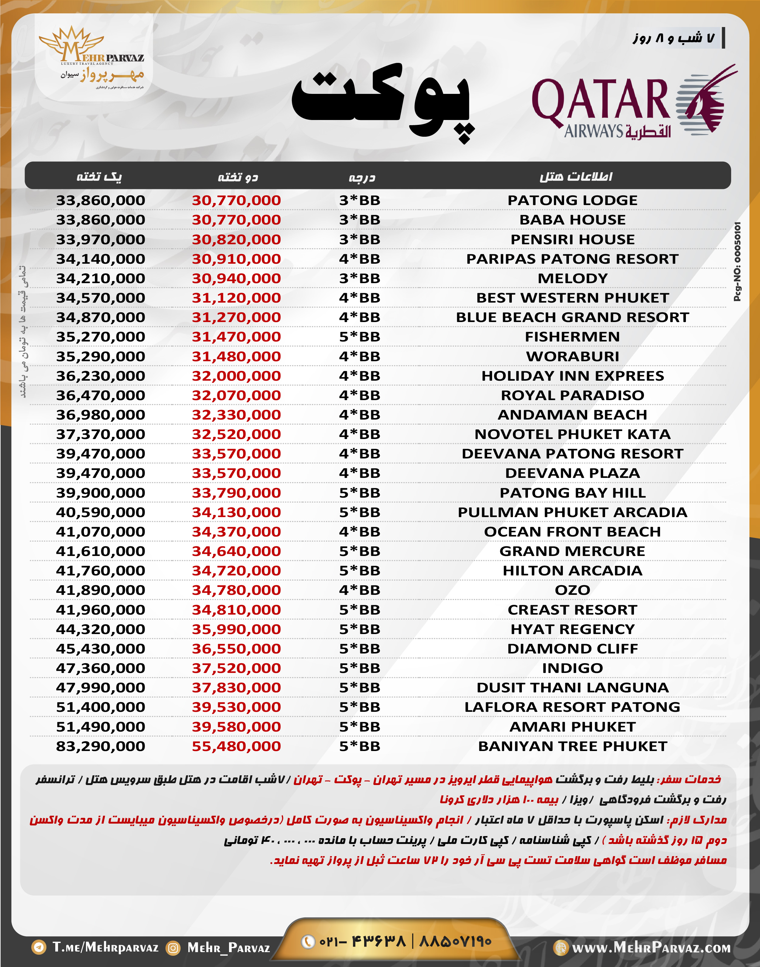 خدمات تور:بلیط رفت و برگشت هواپیمایی قطر ایرویز در مسیر تهران - پوکت - تهران ، 7شب اقامت در هتل طبق سرویس هتل ، ترانسفر فرودگاهی ، ویزا ،بیمه 100هزار دلاری کرونا