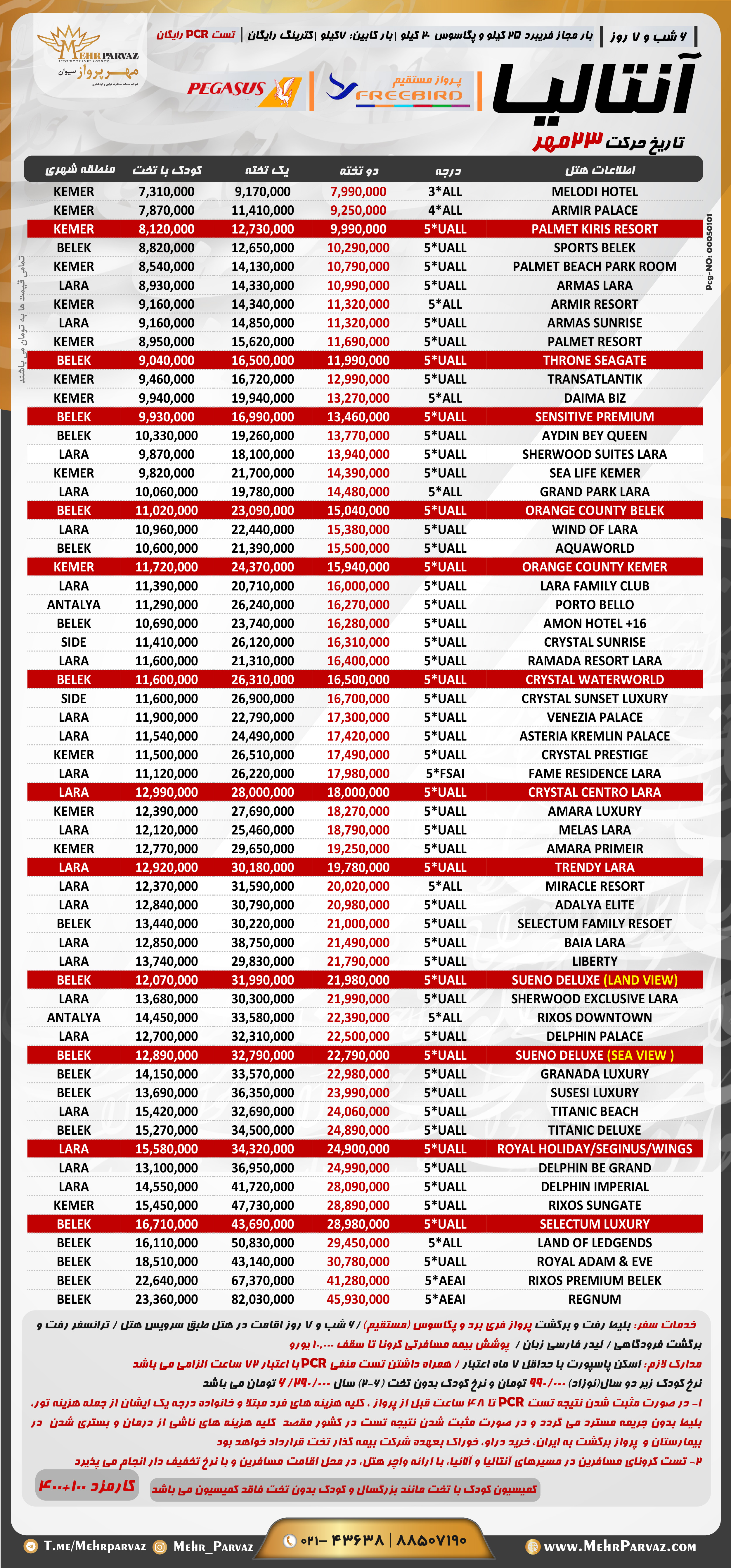 خدمات سفر: بلیط رفت و برگشت پروازمستقیم پگاسوس/6 شب و 7 روز اقامت در هتل طبق سرویس هتل / ترانسفر رفت و برگشت فرودگاهی / لیدر فارسی زبان / پوشش بیمه مسافرتی کرونا تا سقف 10.000 یورو