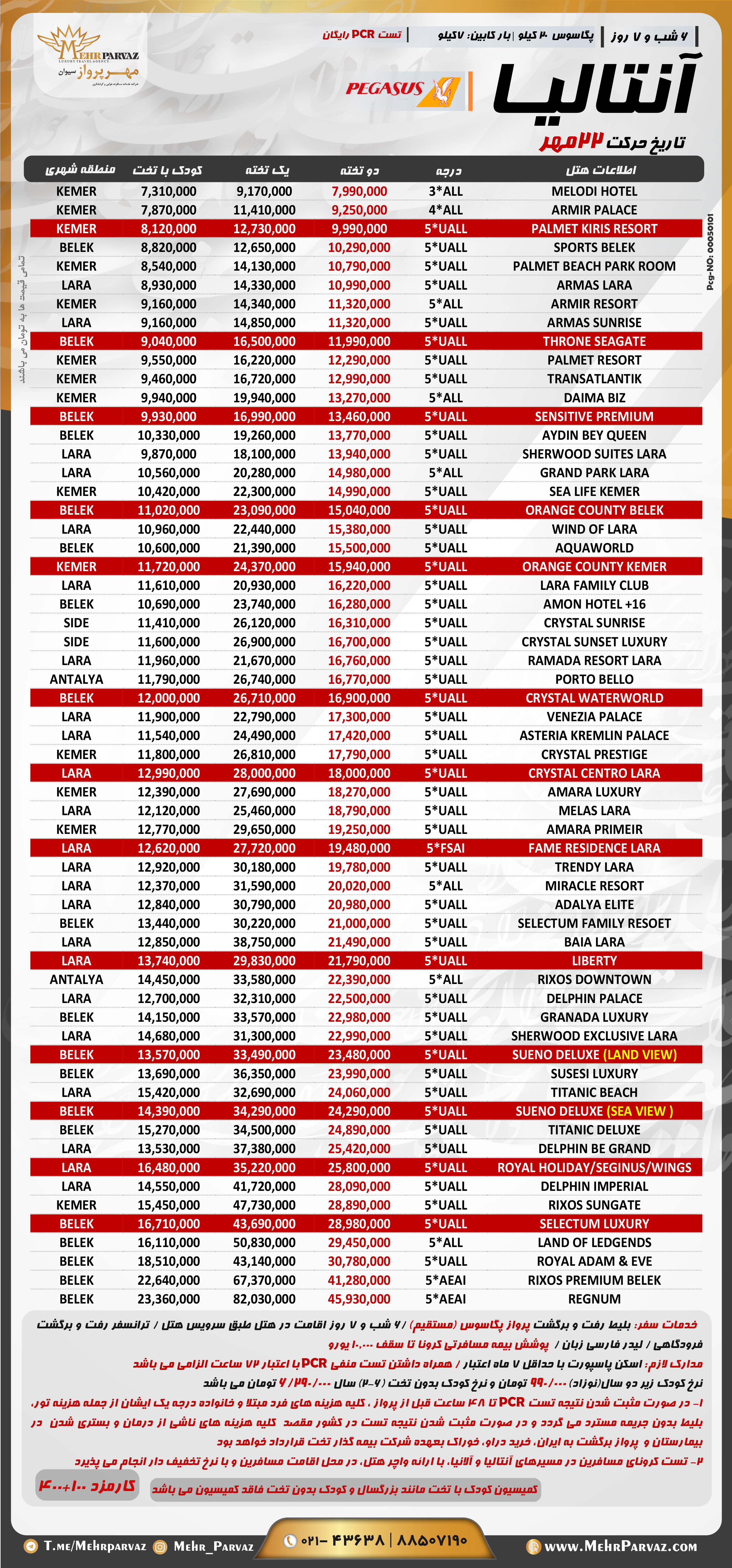 خدمات سفر: بلیط رفت و برگشت پروازمستقیم پگاسوس/6 شب و 7 روز اقامت در هتل طبق سرویس هتل / ترانسفر رفت و برگشت فرودگاهی / لیدر فارسی زبان / پوشش بیمه مسافرتی کرونا تا سقف 10.000 یورو
