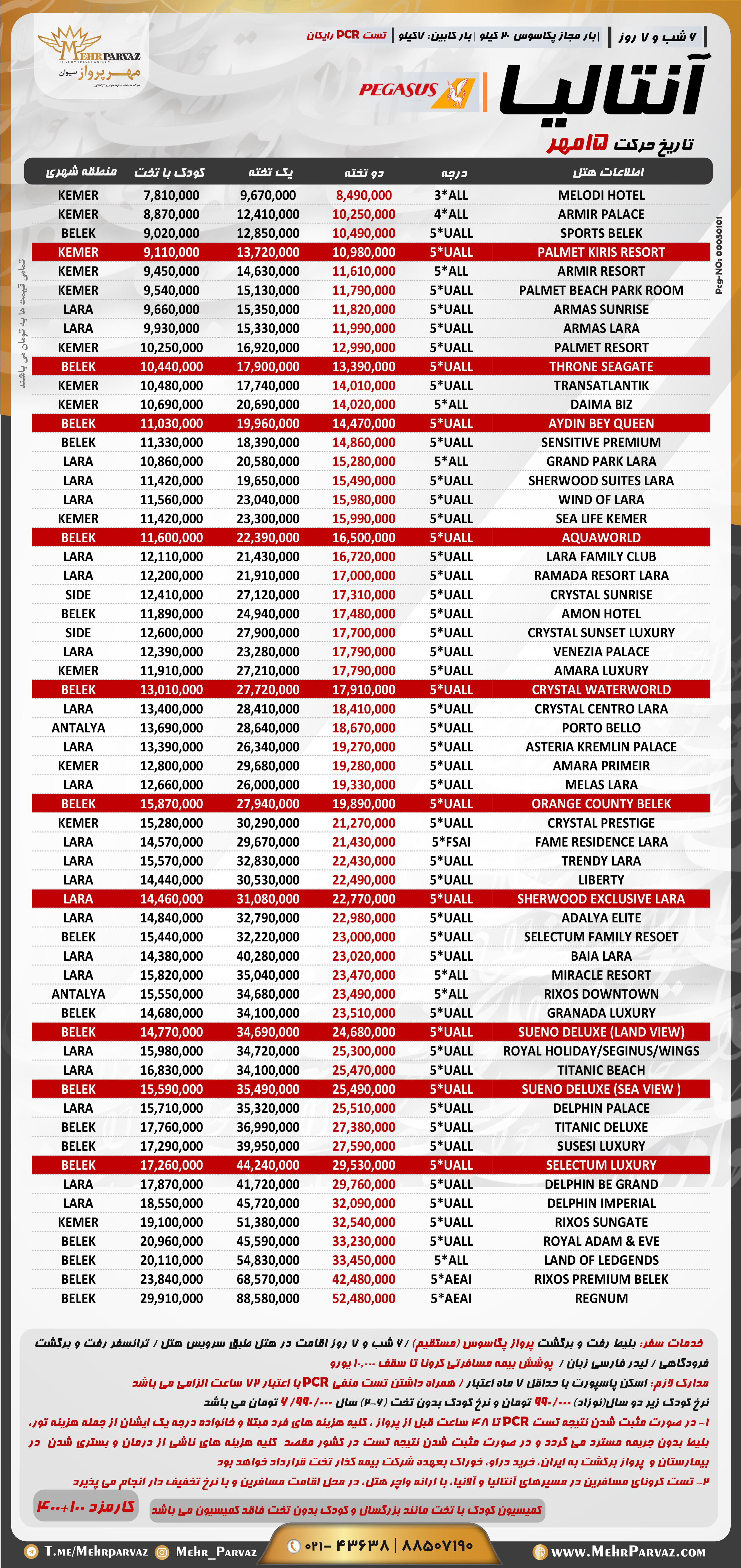 خدمات سفر: بلیط رفت و برگشت پروازمستقیم پگاسوس/6 شب و 7 روز اقامت در هتل طبق سرویس هتل / ترانسفر رفت و برگشت فرودگاهی / لیدر فارسی زبان / پوشش بیمه مسافرتی کرونا تا سقف 10.000 یورو