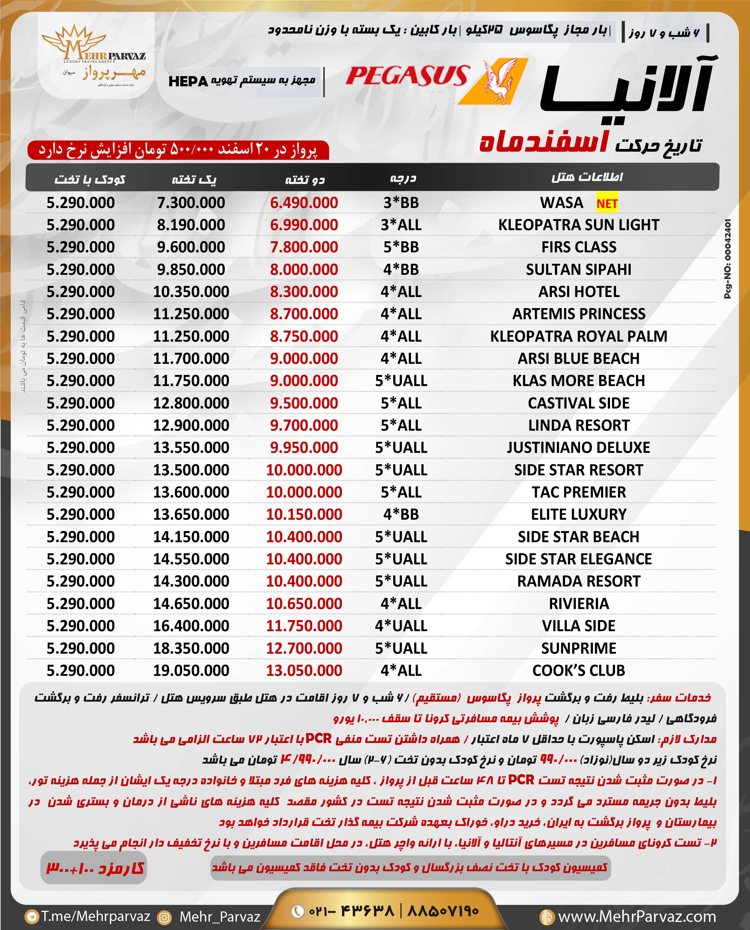 خدمات سفر: بلیط رفت و برگشت پروازپگاسوس/6 شب و 7 روز اقامت در هتل طبق سرویس هتل / ترانسفر رفت و برگشت فرودگاهی / لیدر فارسی زبان / پوشش بیمه مسافرتی کرونا تا سقف 10.000 یورو
