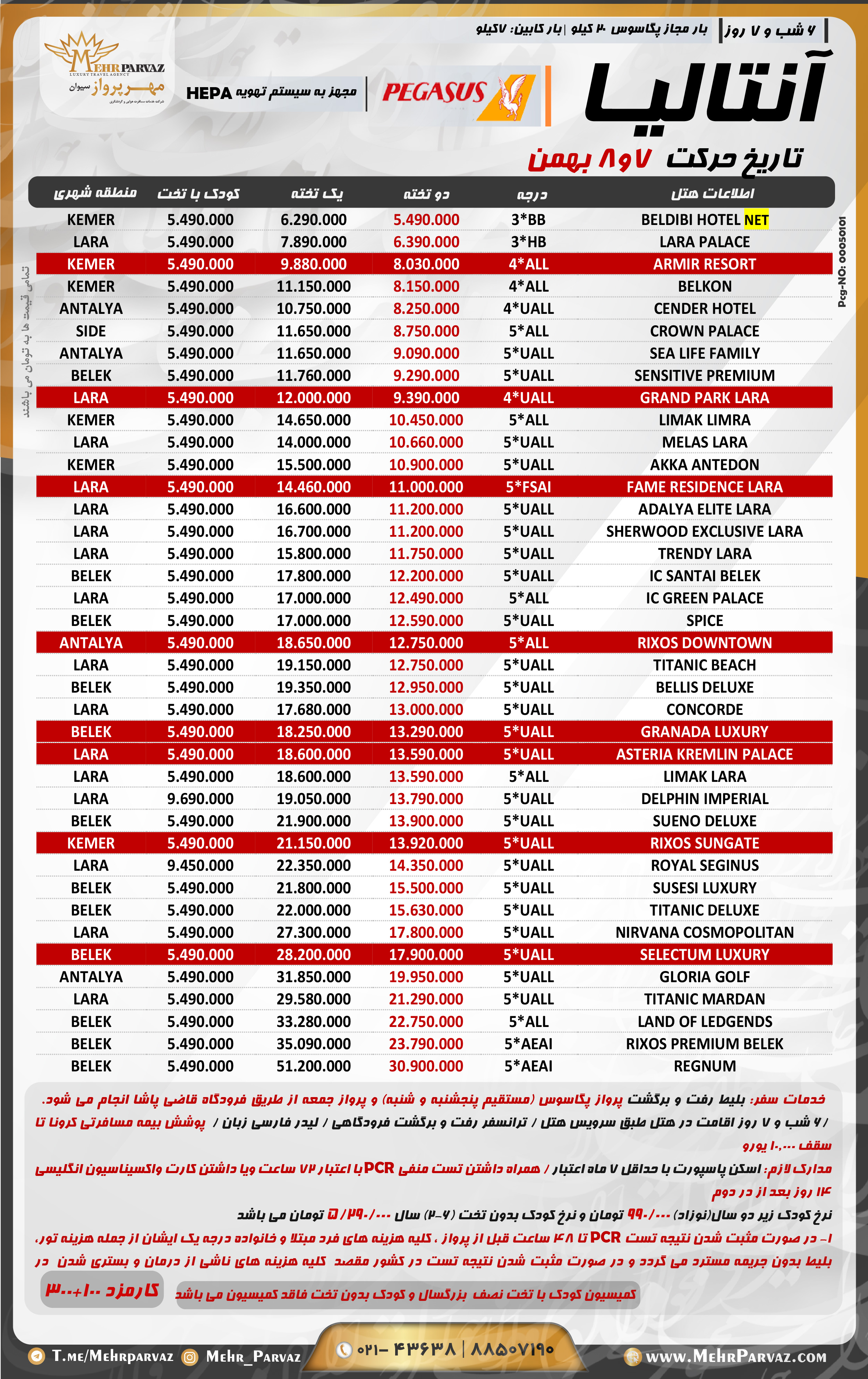 خدمات سفر: بلیط رفت و برگشت پروازمستقیم پگاسوس/6 شب و 7 روزاقامت در هتل طبق سرویس هتل / ترانسفر رفت و برگشت فرودگاهی / لیدر فارسی زبان / پوشش بیمه مسافرتی کرونا تا سقف 10.000 یورو