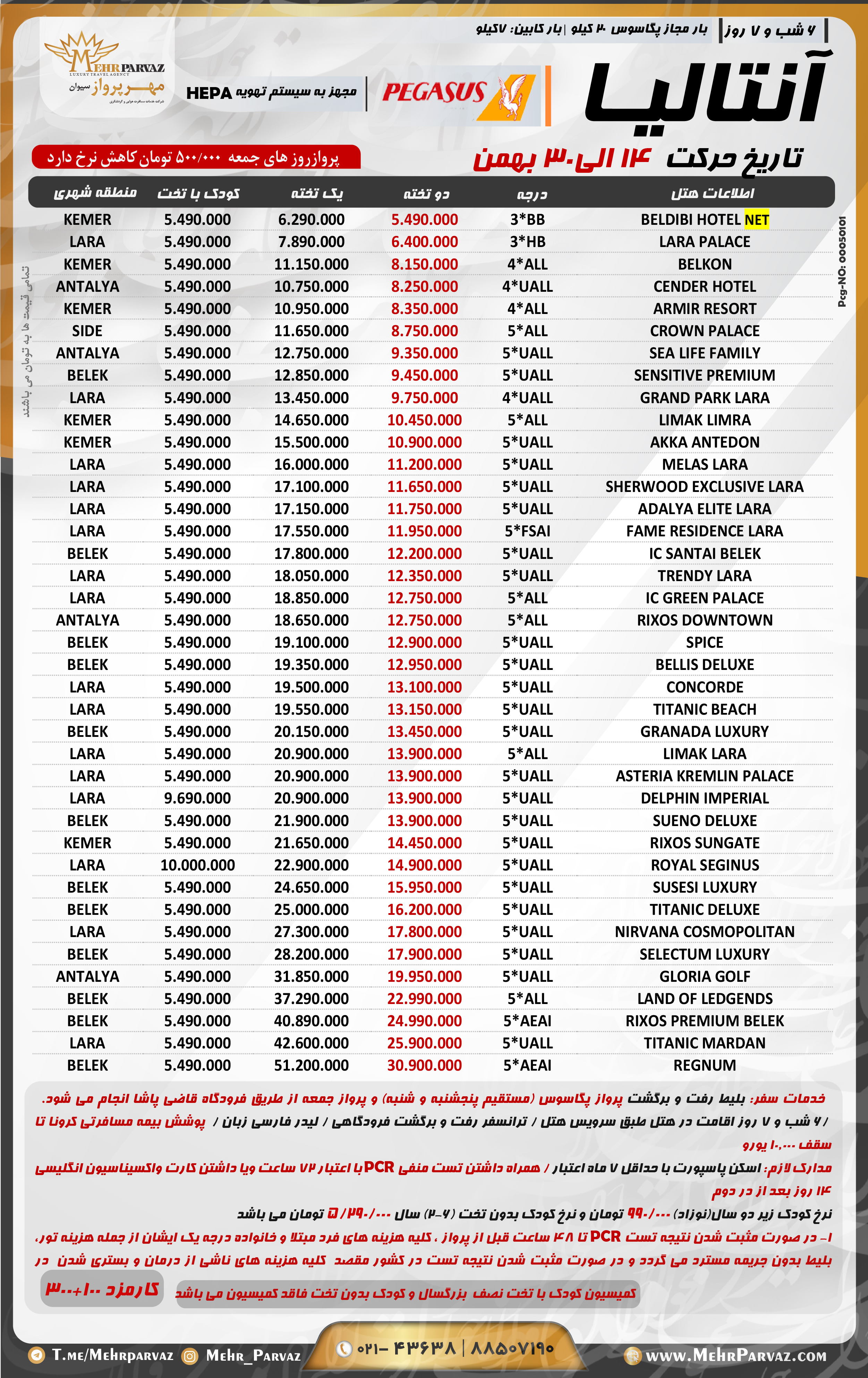 خدمات سفر: بلیط رفت و برگشت پروازمستقیم پگاسوس/6 شب و 7 روزاقامت در هتل طبق سرویس هتل / ترانسفر رفت و برگشت فرودگاهی / لیدر فارسی زبان / پوشش بیمه مسافرتی کرونا تا سقف 10.000 یورو