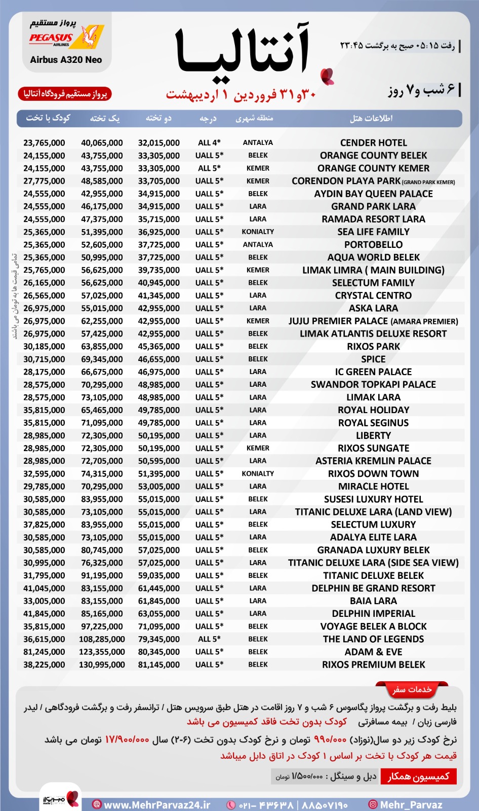 خدمات سفر: بلیط رفت و برگشت پرواز پگاسوس(مستقیم)/6 شب و 7 روزاقامت در هتل طبق سرویس هتل / ترانسفر رفت و برگشت فرودگاهی / لیدر فارسی زبان / تحویل اتاق به محض ورود مسافر