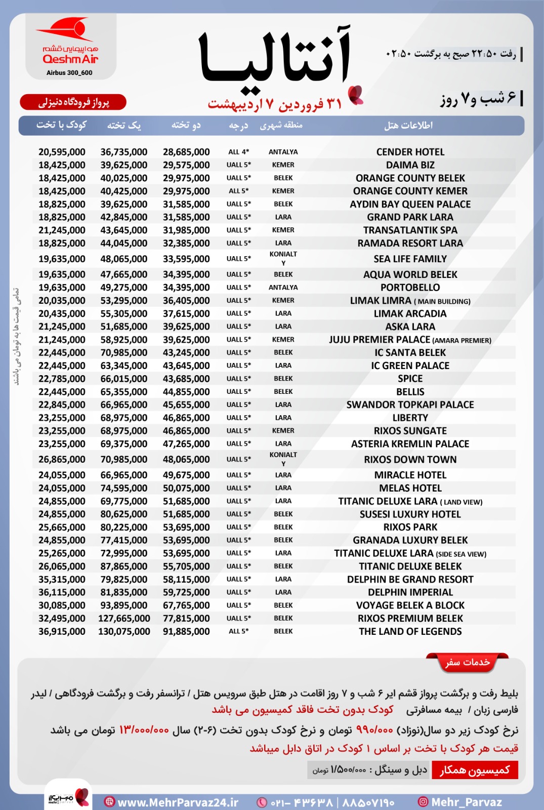 تور آنتالیا 31 فروردین 7اردیبهشت (پرواز قشم ایر)