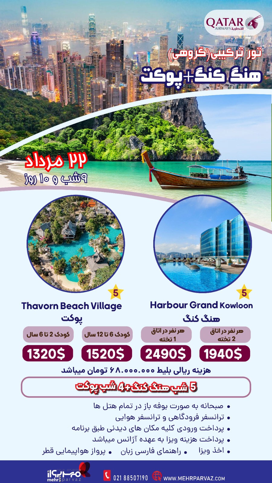 روز اول : ورود به هنگ کنگ انتقال به هتل مابقی روز آزاد