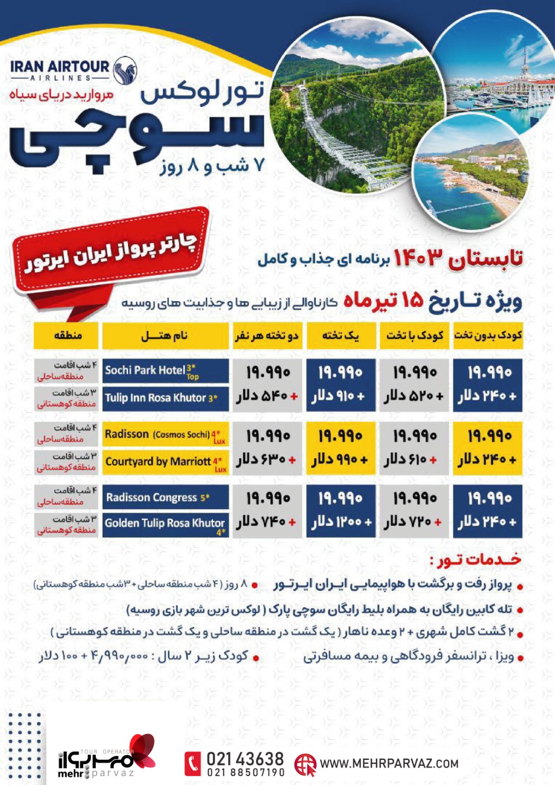 خدمات سفر: بلیط رفت و برگشت پرواز ایران ایرتور/7 شب و 8 روزاقامت در هتل طبق سرویس هتل / لیدر فارسی زبان /ترانسفر فرودگاهی و بیمه /
