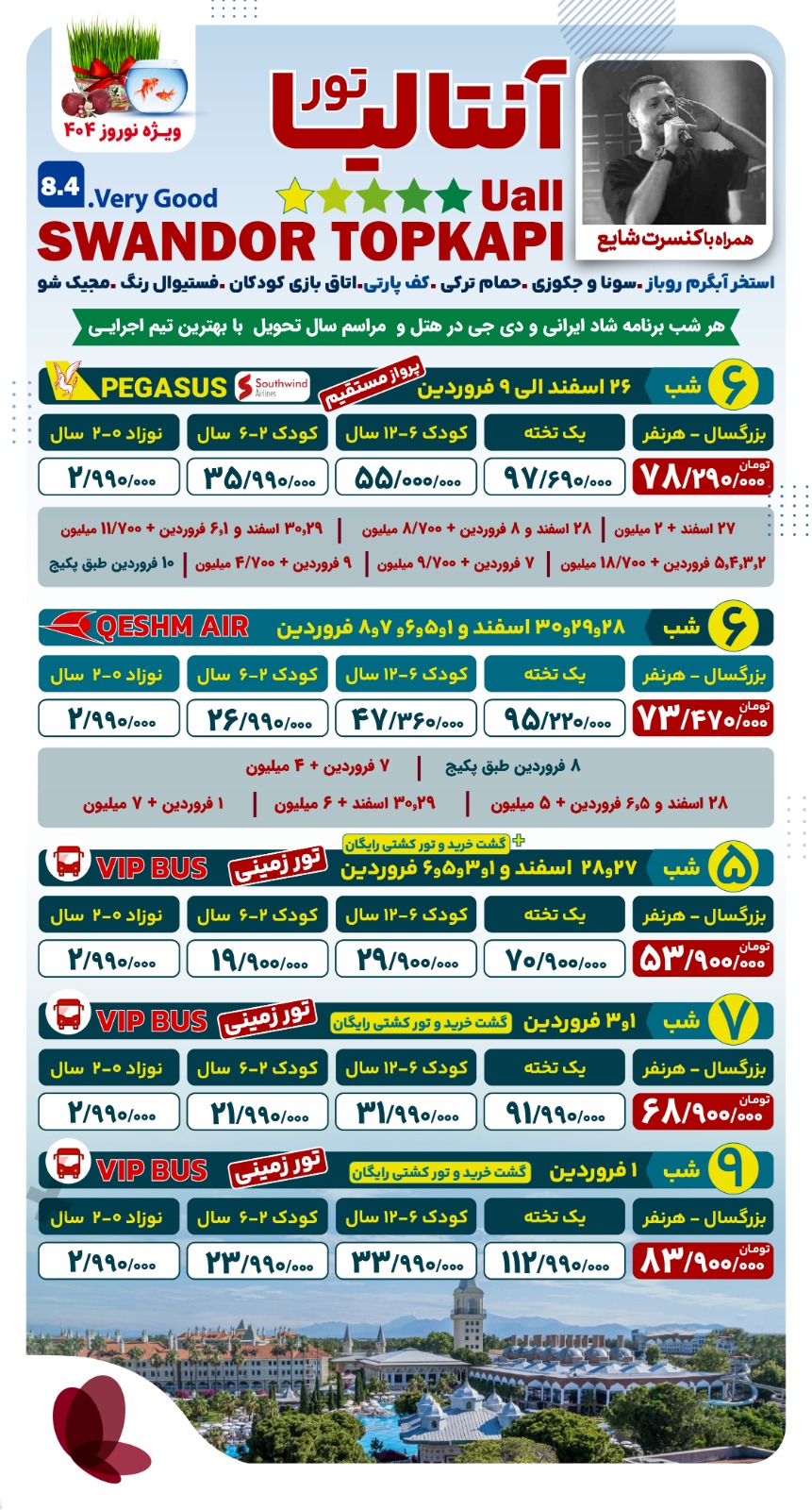 قسط سوم: 20 فروردین 1403 30 درصد مبلغ تور
